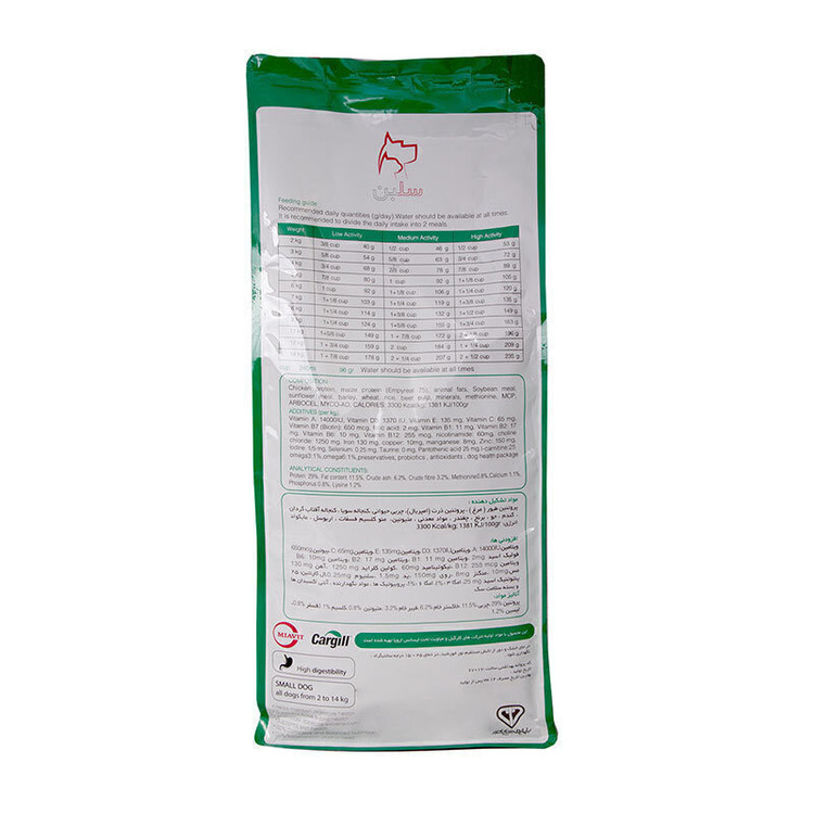 فرمولی که سلبن برای سگ های بالغ نژاد کوچک ارائه کرده برای حیوانی فعال و بالغ مناسب است . در این فرمول علاوه بر ویتامین ها و مواد معدنی لازم از گلوکزامین و ال کارنتین استفاده شده که بهترین انتخاب برای سگ بالغ شما می باشد و وضعیت بدنی و وزنی حیوان را در جایگاهی سالم با تغذیه مناسب نگه می دارد. در این فرمول از حبوبات نیز استفاده شده که باعث هضم آرام غذا میشود. سگ های بالغ ، طعم و سایز کوچک غذای خشک را دوست خواهند داشت و شما هم ازاین غذا رضایتمند خواهید بود.