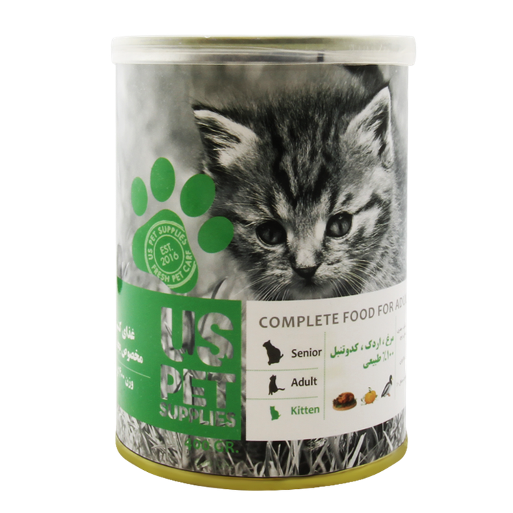 کنسرو غذای بچه گربه یو اس پت با طعم گوشت مرغ و اردک و کدوحلوایی