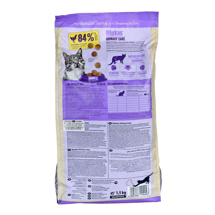 غذای خشک گربه هپی کت مدل urinary care به عنوان یک وعده کامل مخصوص گربه هایی ست که به هر دلیل با مشکل دستگاه ادراری -کلیوی رو به رو هستند .این محصول با حفظ تعادل مواد معدنی باعث تقویت دستگاه ادراری گربه ها می شود . این غذای خشک با کیفیت برای تمامی نژادی های گربه ای که بالغ هستند مناسب می باشد. حاوی ترکیب ویژه ای از مواد غذایی می باشد که برای گربه ها لذت بخش بوده و آنها را به غذا خوردن تشویق می نمایید. گربه ها به صورت غریزی بسیار بد غذا و مشکل پسند هستند بنابراین برای تشویق آنها به غذا خوردن نیاز به مواد غذایی است که خوش خوراک و خوش طعم باشد. این محصول شرکت هپی کت در دستیبابی به این هدف بسیار موفق عمل کرده است. این غذا قابلیت هضم بسیار بالایی داشته و جذب و دفع آن به آسانی صورت می پذیرد. این محصول با ترکیب ویژه ی خود سلامت دستگاه ادراری گربه را تضمین کرده و موجب کنترل وزن آنها می شود. غذای خشک گربه یوریناری همچنین حاوی انواع پروتئین ها بوده که کمک بسیار چشم گیری به تقویت بافت های ماهیچه ای بدن این گربه ها می کند. فیبر موجود در فرمول این غذا موجب تنظیم فلور موجود در روده ها شده و قدرت هضم و دفع غذا را بهبود می بخشد. سرشار از انواع ویتامین ها می باشد که موجب تقویت سیستم ایمنی بدن این حیوانات و افزایش متابولیسم آنها می شود. اسیدهای چرب ضروری موجود در ترکیب این محصول موجب تقویت پوست و موی بدن گربه ها می شود. علاوه بر ترکیبات گفته شده مواد معدنی نیز با تاثیر مثبت خود بر سوخت ساز بدن این گربه ها موجب تقویت استخوان ها ، دندان و موی آنها می شود. در ترکیب این محصول گوشت مرغ و فراورده های گوشتی، غلات، مواد معدنی، ترکیبات گیاهی به چشم می خورد.