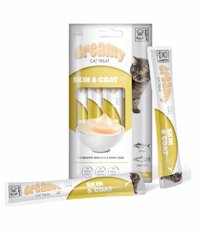 بستنی گربه برند ام پت مدل پوست و مو طعم ماهی تن و ماهی سالمون بسته 4 عددی